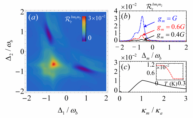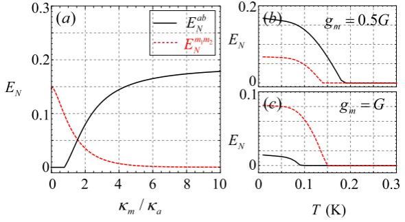 在进一步的分析中,团队系统考察了环境温度对纠缠的影响。结果显示,当磁振子-光子耦合较弱时,光机械纠缠更易在较高温度下保持;而当两者耦合强度接近时,磁振子间的纠缠则表现出更好的热稳定性。此外,在三组分纠缠中,磁振子-磁振子-声子纠缠的鲁棒性优于磁振子-磁振子-光子纠缠,这主要得益于机械模式的冷却效应。
