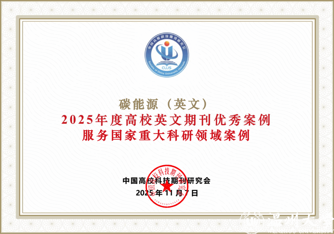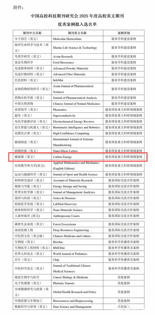 近日,中国高校科技期刊研究会正式发布“2025年度高校英文期刊优秀案例”入选名单,《碳能源(英文)》成功入选“服务国家重大科研领域案例”。本次调研和征集工作由英文期刊专业委员会负责开展。经资格审查、专家评审,最终确定40种期刊入选优秀案例,其中服务学科建设案例10种、服务国家重大科研领域案例10种、服务国际交流合作案例10种、服务科学传播普及案例5种、其他案例5种。