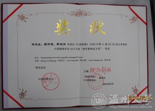 日前,在广州中山大学举行的中国物理学会秋季年会上首次颁发了中国物理学会最有影响论文奖。该奖颁发给过去10年在中国物理学会所属的《Chinese Physics Letter》,《Chinese Physics B》和《物理学报》上发表的优秀论文,共27 篇。亚洲无码 物电学院郑亦庄教授与中国科大郭光灿院士等合作发表在《Chinese Physics B》上的题为《Teleportation of a three-particle entangled W state》的论文荣获一等奖。