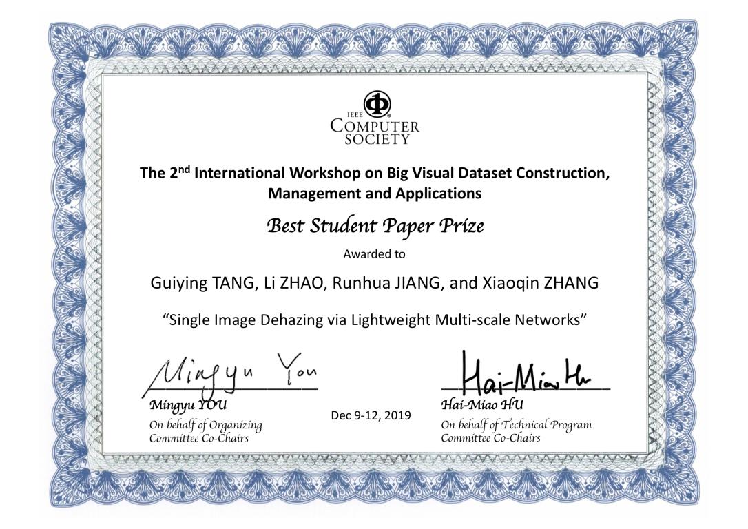 近日,在洛杉矶召开的第二届国际视觉大数据构建、管理与应用会议上,亚洲无码 计算机与人工智能学院张笑钦教授指导的研究生唐贵英、蒋润华的论文《Single Image Dehazing via Lightweight Multi-scale Networks》从众多文章中脱颖而出,获得大会颁发的最佳学生论文奖。