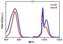 图2. 稀土配合物1-4的激发及近红外发射谱图。