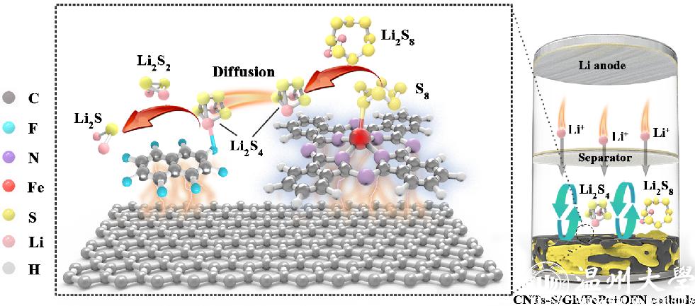 针对在锂硫电池中的硫转化过程中,需要经历多步连串反应,以及复杂的固-液-固多相转化特点,提出了“双控转化模”,分别使用人工模拟酶酞菁铁(FePc)和八氟萘(OFN)选择性地介导长链多硫化物转化(S8→Li2S4)和短链多硫化物转化(Li2S4→Li2S)。采用系列原位光谱、XPS及DFT等研究锂硫电池内部硫转化机制。结果表明,FePc通过Fe∙∙∙S的配位作用,对长链多硫化物起到了有效的锚定和剪切作用;而OFN则促进了与多硫化物的锂键作用,加速了Li2S的液-固成核和生长动力学。该双控系统促进了固-液-固硫转换反应能顺畅进行,显著提高了电池的电化学性能。