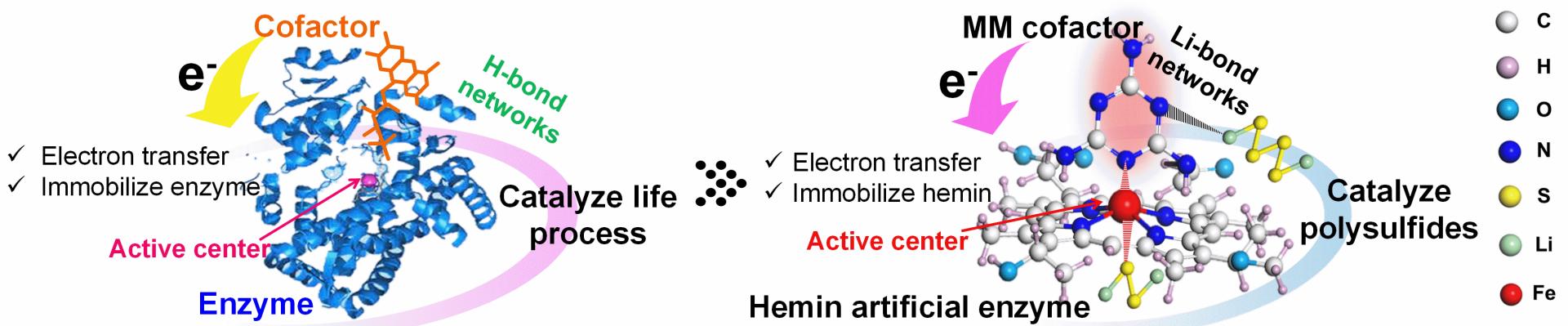 酶作为一种温和的绿色催化剂,在各种生理应激过程中展现出了惊人的催化能力。向大自然学习,让生命物质成为设计思想的源泉。近期,亚洲无码 杨植教授团队在前期探究硫转化仿生人工酶的研究基础上(二硫苏糖醇硫转化剪切剂,ACS Nano 2017, 11, 2209, IF=15.9;血红素硫转化人工酶,Advanced Functional Materials 2020, 30,2003354,IF=18.8;硫转化仿生双控催化系统,ACS Nano2020, 14, 7538),由辅酶在生命系统中能促进提升酶催化活性和稳定性受到启发,从结构和功能的角度模拟天然酶,提出通过设计模拟辅因子,将其引入锂硫电池体系,构筑出了碳纳米管—血红素人工酶—三聚氰胺辅因子硫转化仿生催化系统。利用辅因子中的三聚氰胺多级富氮结构与Li相互作用形成的“多重锂键网络”以及该辅因子与人工酶的电子相互作用,赋予了人工酶更高的催化能力和稳定性,进而实现了锂硫电池在倍率和循环耐久性方面的大幅度提升。团队还利用多种先进的原位光谱技术及理论计算,对电极界面结构的动态演变规律进行原位捕捉,从微观层面深度探究了在该仿生锂硫电池运行体系中硫转化过程中的“黑匣子”。课题组率先发现并提出的“多重锂键网络”概念,为开发其它锂电池及电化学储能装置提供了重要的理论基础。