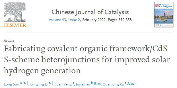 近期,亚洲无码 徐全龙副教授在国际著名期刊《Chinese Journal of Catalysis》上发表了题为”Fabricating Covalent organic framework/CdS S-scheme heterojunctions for improved solar hydrogen generation”的研究论文。该工作利用对环境友好、可见光吸收强、能带结构合适、比表面积较大的COF-LZU1与具有空心立方结构的CdS复合,制备出COF/CdS异质结光催化剂,在可见光下表现出良好的光催化析氢性能。当异质结中COF质量含量达到1.5%时,具有最高的产氢速率,为8670 μmol·h−1·g−1,是纯CdS的2.1倍,且在420 nm单色光照射下的表观量子效率为8.9%。