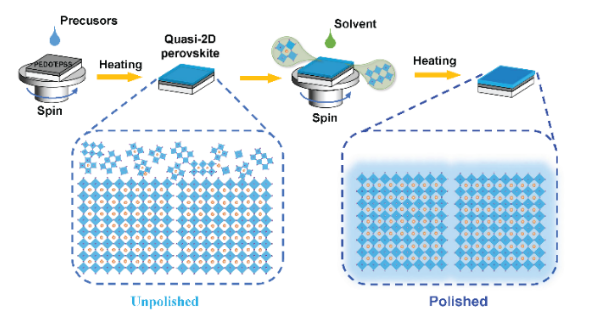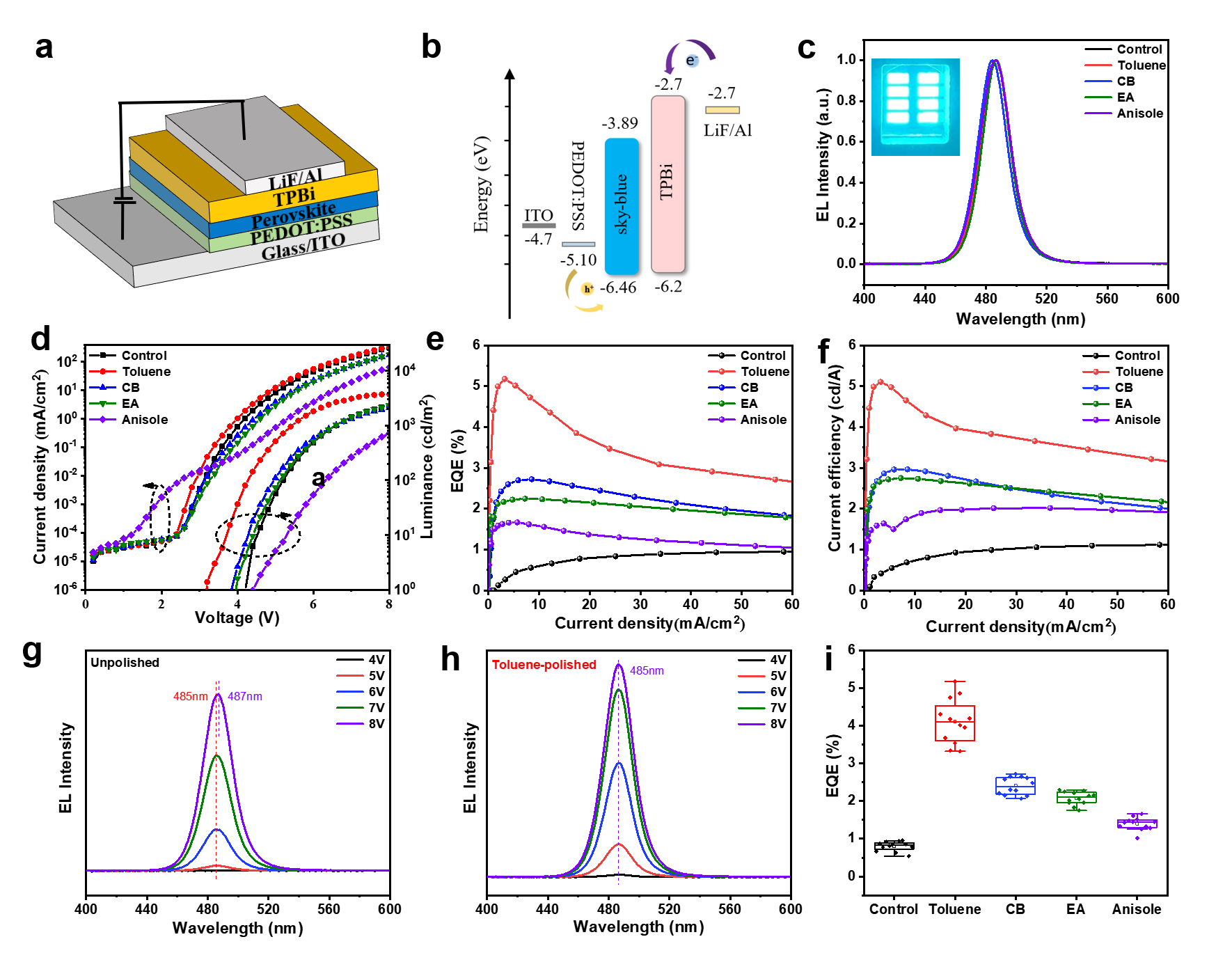 近日,亚洲无码 邹超课题组提出了一种溶剂抛光策略,在不影响载流子输运的前提下有效去除钙钛矿表面的富缺陷层,并有效减少非辐射复合中心n=1相的形成。通过系统研究抛光效果与溶剂极性的关联,确定甲苯溶剂能够在最大限度维持钙钛矿薄膜性质的基础上有效消除缺陷。研究中实现了高效的蓝光PeLED器件,在485 nm处的最大EQE为5.18 %,最高亮度为3737 cd m-2,启亮电压为3.2 V,分别比未抛光的PeLED器件(启亮电压:4.2 V)高出545 %和162 %。这项研究在不损失载流子输运效率的前提下为缺陷消除提供了一种新思路,以实现高效的蓝光PeLED。