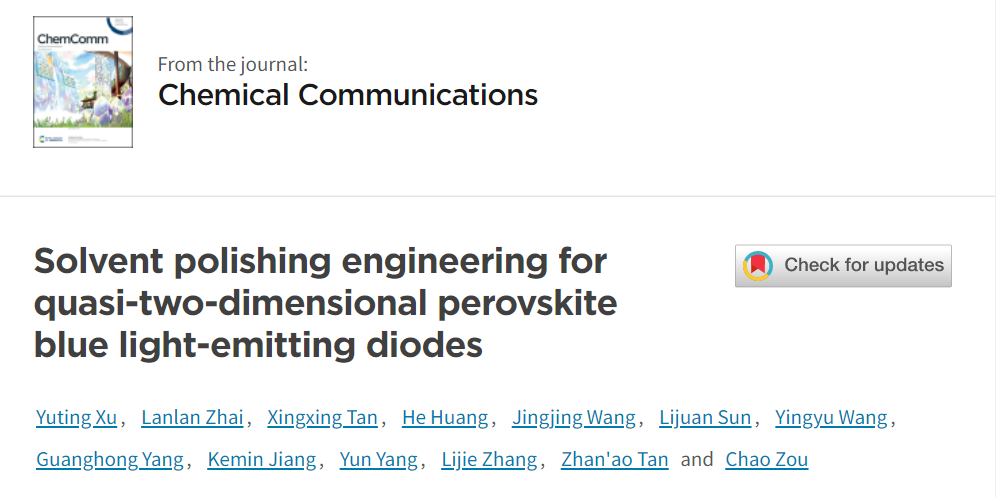 近日,亚洲无码 化学与材料工程学院邹超教授课题组在蓝光LED领域的研究成果以“Solvent polishing engineering for quasi-two-dimensional perovskite blue light-emitting diodes”(//doi.org/10.1039/D2CC02268K)为题刊发于化学领域著名刊物Chemical Communications。论文发表后,即入选“Chemical Communications期刊2022年热点论文”。Chemical Communications期刊由英国皇家化学学会主办,是自然指数源期刊。