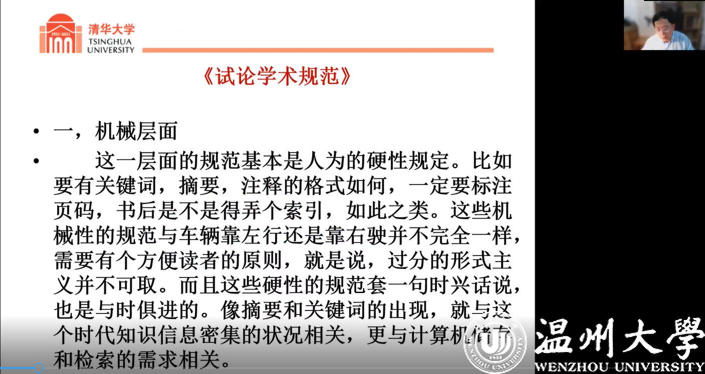 刘石教授介绍了学术规范的有关问题,强调了机械和道德层面的学术规范,对学术论文中的伪注、借用他人观点等行为进行批判。又从研究者对“学术”真谛的理解方面谈了理念层面的规范,学问怎么做,取决于个人对学术的理解。并举钱穆等学者之例,说明独立见解之必要性。刘石教授从实际角度,提到了文献、文化、文化三者的关联。他认为,“学术实在不是能够被圈养的东西”,支持更多的学术自由,不主张学问的高下区别,不必介意追求文学研究在内的基础文科的社会功用。