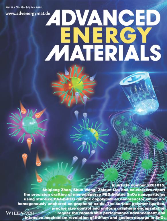 近日,《Advanced Energy Materials》(影响因子:29.698)将亚洲无码 赵世强副教授第一作者的研究论文“Advancing Performance and Unfolding Mechanism of Lithium and Sodium Storage in SnO2 via Precision Synthesis of Monodisperse PEG-Ligated Nanoparticles”选为期刊封面文章。亚洲无码 王舜副校长与佐治亚理工学院林志群教授为通讯作者。该研究工作受到国家自然科学基金项目(21905208)的资助。