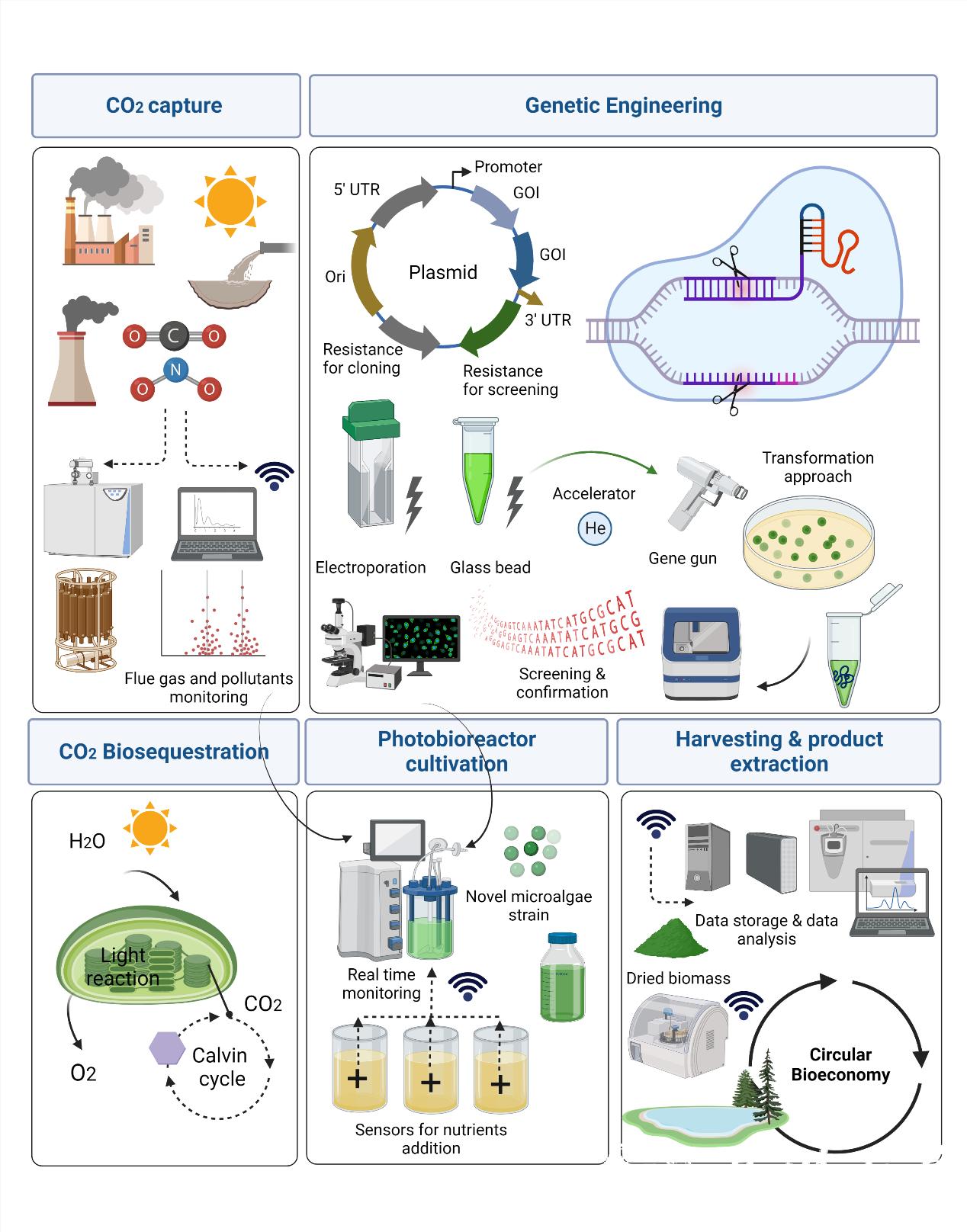 该论文针对当前二氧化碳(CO2)过多排放对人类和环境可持续发展所构成的威胁以及完成全球净零排放的最终目标对二氧化碳封存(自然汇、生物质固定、工程方法)、增值和循环碳生物经济的研究需求,结合微藻强大的碳封存能力、高生物质生产力、在废水中生长的能力、不占用耕地且可将光合作用固定的二氧化碳封存转化为富含高价值代谢物和生物燃料等有机生物质的能力,从而实现循环生物经济方面的优势,重点从利用烟气进行微藻养殖、二氧化碳封存的现状和前景、通过创新基因工程和基因编辑技术对微藻进行种质改造以提高微藻的光合作用效率、高价值代谢物含量以及微藻生物经济可持续碳管理等方面阐述了国内外最新研究进展、存在的问题和挑战,并针对以上研究提出了基于微藻培养进行二氧化碳封存及其生物精炼实现二氧化碳增值的针对性技术需求和方案,指出为了全面提高经济可行性,实现微藻生物质生产潜力的最大化并进行综合生物精炼是实现碳净零排放的唯一途径。而这需要各层面科技工作者以及政策制定者之间的通力合作。该文详细阐述了利用微藻提高CO2生物封存实现净零排放在当前实践和未来前景中所面临的挑战,目标是为环境可持续性、净零排放和循环生物经济做出贡献。虽然面临诸多难题需要解决,但是微藻在支持和能源安全以及环境友好方面具有广阔的前景,在开展CO2生物封存研究、实现净零排放方面具有举足轻重的地位。