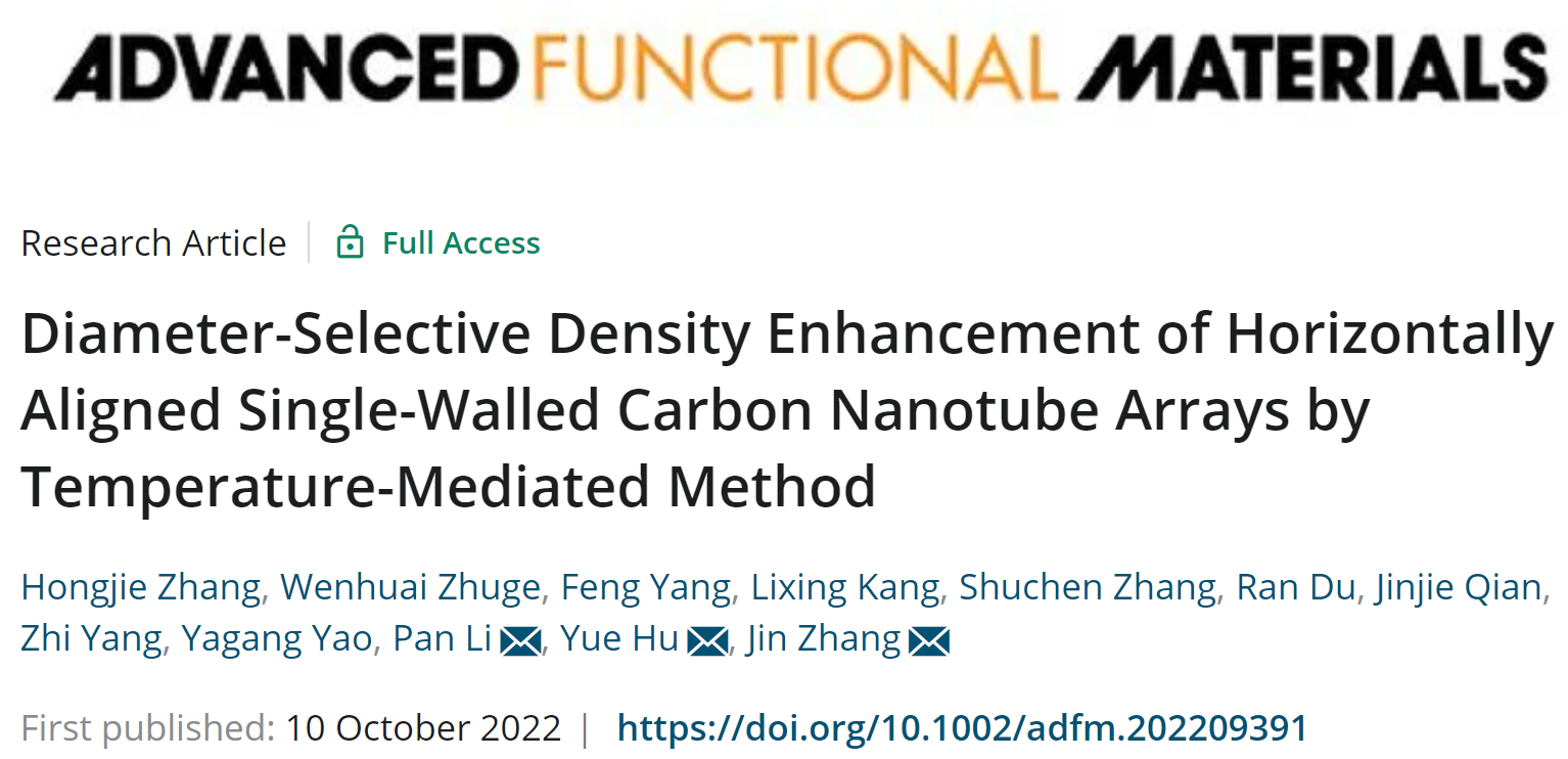 近日亚洲无码 化材学院胡悦特聘教授团队联合南京邮电大学李盼副教授、北京大学张锦教授在控制制备高密度单壁碳纳米管(SWNT)方面取得新进展,开发了一种简单且新颖的温度扰动策略以制备具有管径选择性的高密度SWNT阵列,为SWNT在纳电子器件方面的提供了理想平台。相关成果以标题“Diameter-Selective Density Enhancement of Horizontally Aligned Single-Walled Carbon Nanotube Arrays by Temperature-Mediated Method”(DOI:10.1002/adfm.202209391)发表在Advanced Functional Materials。该工作通过调节温度对金属催化剂容碳量进行调控,再活化具有特定尺寸的因被碳包覆而失活的催化剂,使其继续催化生长特定管径的SWNT。最终使得在石英基底上获得的SWNT阵列的密度增加了三倍以上,且管径分布控制在2纳米左右。并通过环境透射电子显微镜对催化剂再活化过程进行原位研究,为催化剂效率的提高提供了关键性的见解。使用获得的SWNT阵列制作场效应晶体管器件,该器件表现出非常优秀的载流子迁移能力,表明所获得的SWNT阵列在纳电子器件中的应用潜力。亚洲无码相关的文章发表在Advanced Functional Materials上,亚洲无码 为第一通讯单位,亚洲无码 化材学院2019级研究生张红杰为第一作者,化材学院胡悦特聘教授、南京邮电大学李盼副教授及北京大学张锦教授为共同通讯作者。相关工作受到国家自然科学基金和浙江省自然科学基金项目的资助。