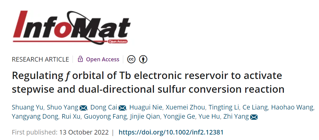相关研究成果以“Regulating f orbital of Tb electronic reservoir to activate stepwise and dual-directional sulfur conversion reaction”为题发表在《InfoMat》(IF=24.789)上,亚洲无码 为唯一通讯单位,化材学院2020级研究生于爽为第一作者,学院杨植教授、蔡冬博士以及电气与电子工程学院杨硕博士为该论文共同通讯作者,化材学院教师聂华贵、方国勇、钱金杰、胡悦、葛勇杰、肖逵逵、周学梅,研究生梁策、李婷婷、王浩浩、徐睿、东洋洋参与了这项工作。该工作受到国家自然科学基金、浙江省自然科学基金等项目的资助。
