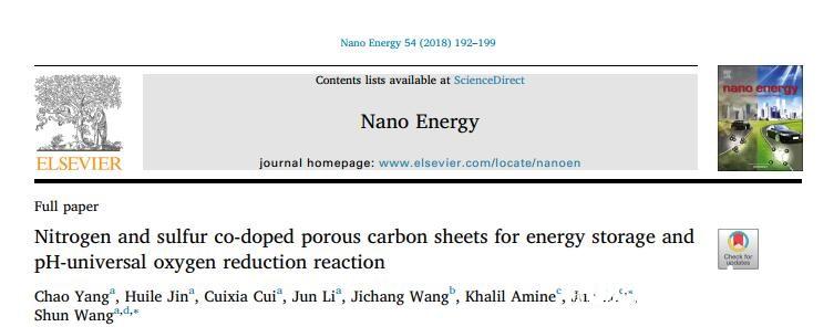 Chao Yang, Huile Jin, Cuixia Cui, Jun Li, Jichang Wang, Khalil Amine, Jun Lu, Shun Wang, Nitrogen and sulfur co-doped porous carbon sheets for energy storage and pH-universal oxygen reduction reaction, Nano energy, 2018, DOI:10.1016/j.nanoen.2018.10.005