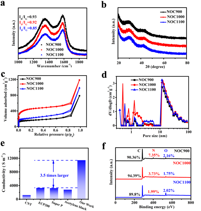 图1:不同碳化温度下NOC的结构表征。(a) 拉曼光谱;(b) XRD图谱;(c) 氮吸附/解吸等温线;(d) 孔径分布;(e) NOC1000与商业材料的电导率比较;(f) XPS图谱。