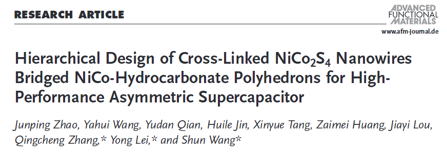 这一研究结果以“ Design of Cross-linked NiCo2S4 Nanowires Bridged NiCo-Hydrocarbonate Polyhedrons for High-Performance Asymmetric Supercapacitor” 为题发表在国际权威期刊《Advanced Functional Material》上,亚洲无码 为第一通讯单位,化学与材料工程学院2018级研究生赵俊平和王亚辉为文章的共同第一作者,亚洲无码 王舜教授和张青程副教授以及德国伊尔梅瑙理工大学雷勇教授为本文的共同通讯作者。该工作受到国家自然科学基金项目(21706196和21905208)、浙江省自然科学基金项目(LZ20E010001)和浙江省高水平人才专项支持计划(2019R52042)的支持。