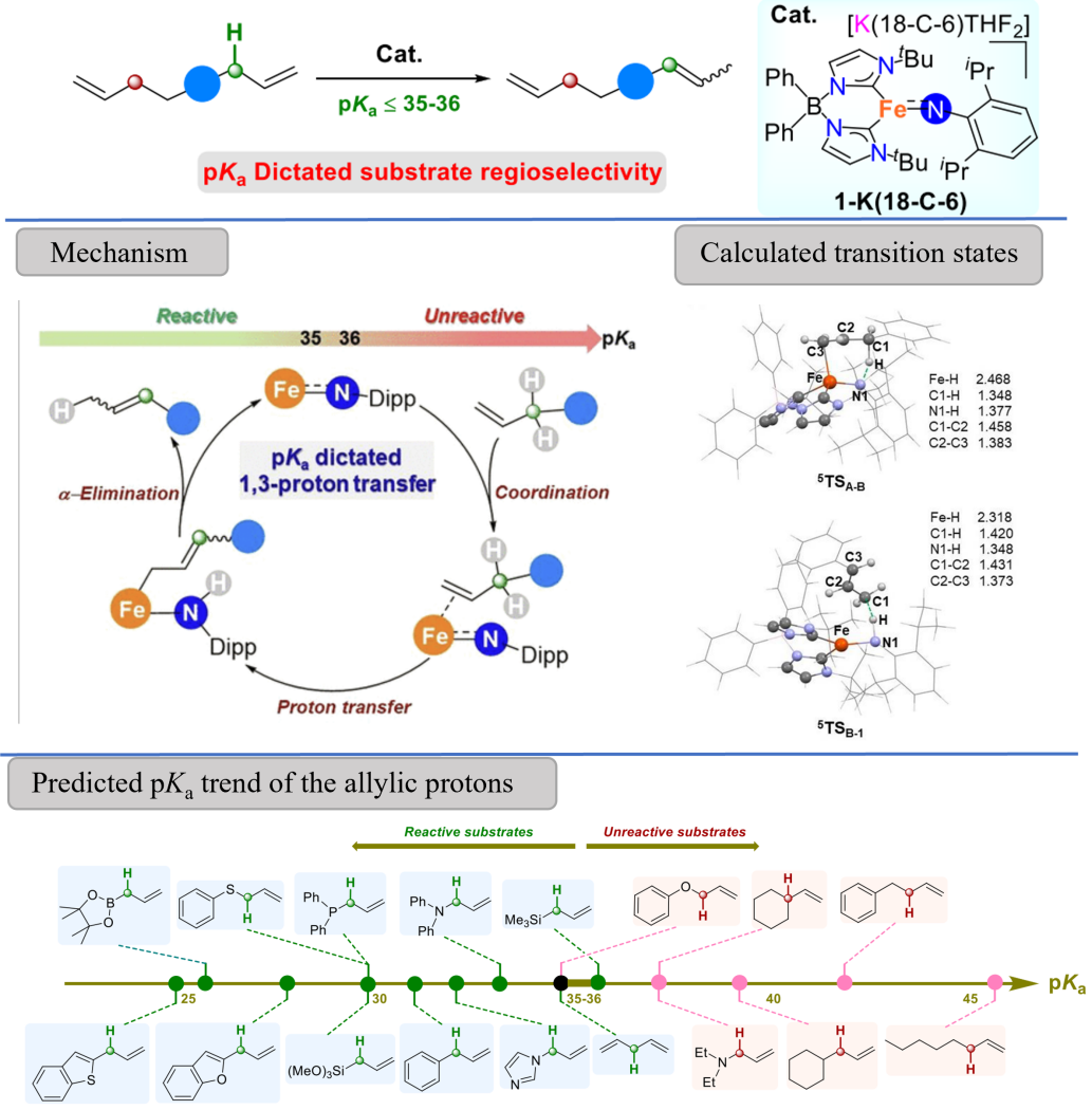 亚洲无码 化材学院汤浩教授理论计算课题组与美国印第安纳大学化学系Jeremy M. Smith教授课题组合作报道了高自旋三配位Fe(II)亚胺配合物(1-K-(18-C-6))催化的双键转位反应,通过1,3-氢质子迁移实现了1-烯烃向2-烯烃的转化。其中,双键转位是由Fe(II)中心和碱性亚胺配体的协同作用实现。DFT计算的过渡态结构揭示了烯丙基氢直接从1-烯烃转移到亚胺配体上(5TSA-B) ,随后烯丙基C1与氨基配体上的氢结合 (5TSB-1)获得相应的产物,而Fe–H物种并未参与。底物烯丙基质子的pKa决定反应的区域选择性,而且双键转位发生的转折点在于烯丙基质子的pKa ≈ 35−36处。值得一提的是:铁催化剂的高自旋(S = 2)允许反应具有良好的官能团耐受性,包括典型毒化催化剂的位点,如胺、含N-杂环、膦化物等。