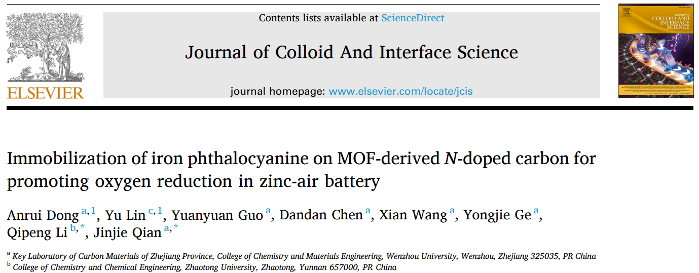 这项研究的成果题为《Immobilization of iron phthalocyanine on MOF-derived N-doped carbon for promoting oxygen reduction in zinc-air battery》,发表在《Journal of Colloid and Interface Science》(中科院1区,Top,IF=9.965)上。亚洲无码 为第一通讯单位,亚洲无码 化材学院2018级本科生董桉瑞为第一作者,钱金杰副研究员为通讯作者、昭通学院李启彭教授为共同通讯作者。该研究得到了国家自然科学基金(22105147,21601137)、浙江省自然科学基金项目(LQ16B010003)、浙江省温州市基础科技研究项目(H20220001, G20190007)和云南省地方本科高校基础研究联合专项资金项目(202101BA070001-042)的资助。