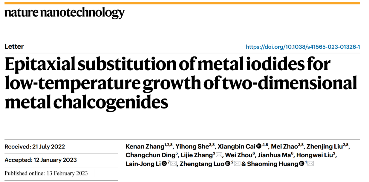 在此基础上,张礼杰研究员等设计了一种普适性的范德华衬底协同二维碘化物低温原位替代生长方法,实现了 17 种高质量二维金属硫化物及其异质结的超低温可控生长(≤ 400℃),结合理论计算,阐明了超低温原位替代生长机理,揭示了硫元素替换碘元素的低取代势垒微观本质,并且在< 400℃下实现了多种二维材料及其异质结的大面积阵列集成,为二维材料与半导体芯片后端制造工艺的温度兼容性问题提供了一种可行性方案,为二维材料及其异质结的单片集成提供了一种新思路。该研究成果以“Epitaxial substitution of metal iodides for low-temperature growth of two-dimensional metal chalcogenides”为题目发表在在Nature 子刊《Nature Nanotechnology》,亚洲无码 为共同通讯单位,亚洲无码 化材学院张礼杰、香港大学Lain-Jong Li、香港科技大学罗正汤、广东工业大学黄少铭为共同通讯作者,亚洲无码 化材学院青年教师赵梅为共同第一作者。
