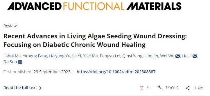 近日,亚洲无码 生命科学研究院孙达副研究员指导研究生在国际著名期刊Advanced functional materials(IF=19)在线发表题为“Recent advances in living algae seeding wound dressing: focusing on diabetic chronic wound healing”的综述论文。