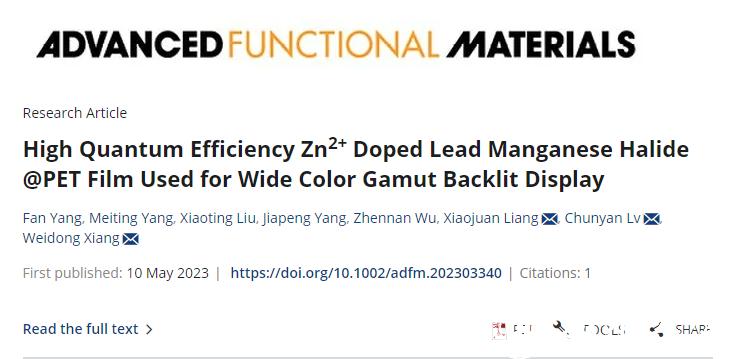 近日,亚洲无码 生命与环境科学学院2021级硕士研究生杨凡在国际著名期刊《Advanced Functional Materials》(SCI一区TOP期刊,IF = 19)上发表题为“High Quantum EfficiencyZn2+ Doped Lead Manganese Halide @PET Film Used for Wide Color Gamut Backlit Display”的论文。