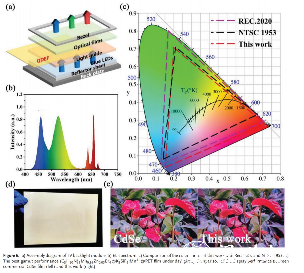 本研究通过室温蒸发法简便制备了四乙基溴化锰(C8H20N)2MnBr4,从内部结构引入Zn2+改善了其稳定性差的固有缺陷,得到稳定性最佳的变体(C8H20N)2Mn0.95Zn0.05Br4。采用双层PET包覆的策略,设置了一系列粉胶比与厚度梯度测试,并综合指标得到荧光强度与稳定性表现最佳的薄膜。最终与商业荧光粉匹配制备出光转换膜,色域可达到NTSC 1953标准的112%和Rec 2020标准的83%,首次实现了将有机无机溴化锰材料用于背光显示领域。本研究为开发环保、低成本、高性能液晶显示器提供了一条可行的思路。