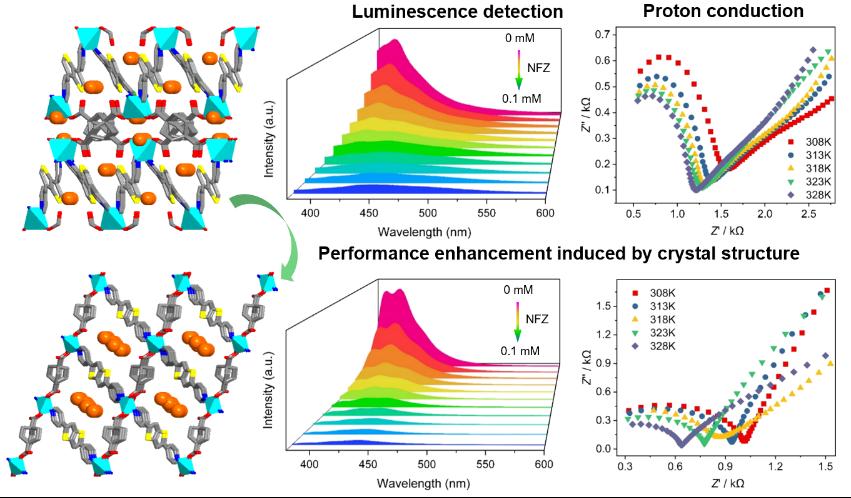 5-硝基呋喃环类抗生素作为一类常见的抗生素,已被广泛用于治疗人类和动物的细菌感染和原生动物,但是抗生素的广泛使用甚至滥用导致其残留于水、土壤、动植物中,并最终在生态循环中扩散,对人类健康和生态系统构成严重威胁。基于金属有机框架(MOFs)材料的荧光传感技术具有操作简单、速度快、灵敏度高的优势,为检测抗生素提供了新思路。在金属有机框架中引入N、O、S原子不仅可以提供荧光反应的位点,而且有助于形成大量的氢键,提高质子传导性能。在此背景下,设计并开发具有发光和质子传导性能的高稳定性MOF具有重要的意义。