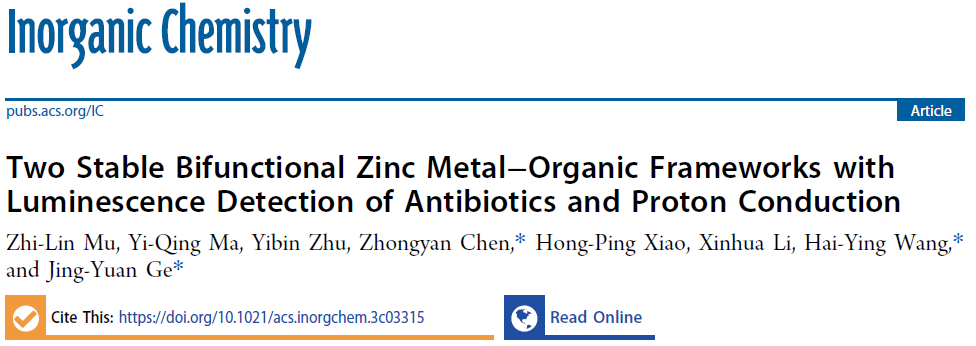 相关研究成果以“Two Stable Bifunctional Zinc Metal-Organic Frameworks with Luminescence Detection of Antibiotics and Proton Conduction”为题,近日发表在《Inorganic Chemistry》期刊上,亚洲无码 作为第一通讯单位,我院2021级硕士研究生穆志林为第一作者,陈忠研博士、王海英副研究员和葛景园博士为共同通讯作者。该工作受到浙江省基金项目(LQ21B050001),国家自然科学基金(21801054和21801127)和温州基础基金科研项目(Y20210265)项目的资助。