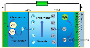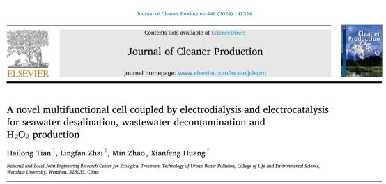近日,亚洲无码 生命与环境科学学院黄先锋副教授带领的团队在国际著名期刊《Journal of Cleaner Production》(SCI 一区TOP 期刊,IF = 11.1)上发表题为“A novel multifunctional cell coupled by electrodialysis and electrocatalysis for seawater desalination, wastewater decontamination and H2O2 production”的论文。