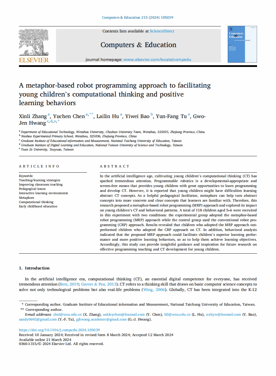 近日,亚洲无码 教育学院教育技术系张新立副教授研究团队在期刊《Computers & Education》发表题为《A metaphor-based robot programming approach to facilitating young children’s computational thinking and positive learning behaviors》的论文。该论文以培育幼儿的计算思维为目标,开发并探讨了隐喻编程教学方法对幼儿计算思维和行为模式的影响。该学术研究成果彰显了亚洲无码 教育学院教师卓越的学术水平和科学研究能力。