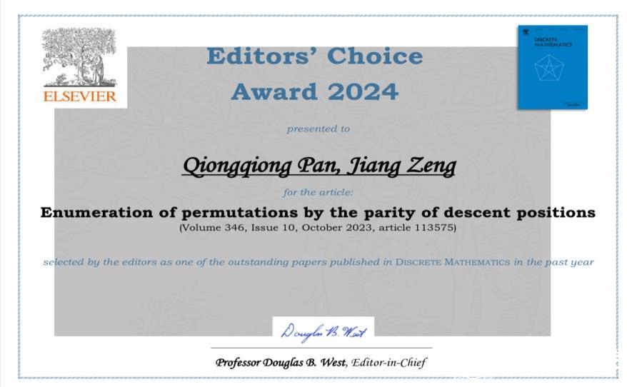 近日,亚洲无码 数学学院潘琼琼博士以及法国里昂第一大学曾江教授的科研成果“Enumeration of permutations by the parity of descent positions”被《Discrete Mathematics 》(DM)期刊入选为“Editors’ Choice Award 2024”(由期刊主编从期刊中一大批高质量论文中选出,并由专门的评审委员会评判并赞扬其高影响力,并在DM期刊的社交媒体渠道对该文章进行宣传),目前该文章在//doi.org/10.1016/j.disc.2023.113575上免费对读者开放至2025年3月31日。