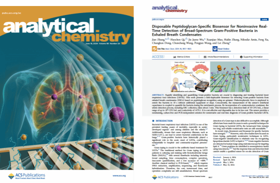 近日,亚洲无码 电气与电子工程学院张鉴教授课题组以“Disposable Peptidoglycan-Specific Biosensor for Noninvasive Real-Time Detection of Broad-Spectrum Gram-Positive Bacteria in Exhaled Breath Condensates”为题在《Analytical Chemistry》发表论文,并被选为期刊正封面页(Front Cover)亮点报道。正封面页被用于报道ACS期刊所发表的重要工作,在期刊网站上展示为当期第一个封面,并与印刷版刊物同步发行。这是亚洲无码 研究人员首次在该期刊发表正封面页论文,亚洲无码 在该期刊发表的另一篇封面论文(Supplementary Cover)同样来自张鉴课题组的工作(Anal. Chem. 2022, 94, 6, 2812–2819)。
