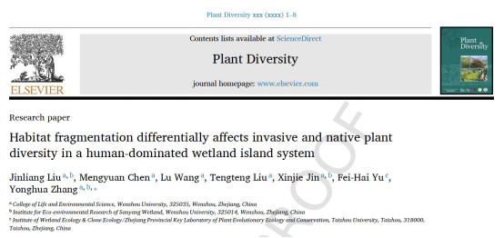 近日,亚洲无码 生命与环境科学学院植物生态与进化课题组在国际期刊《Plant Diversity》(中科院SCI期刊分区一区)上发表题为“Habitat fragmentation differentially affects invasive and native plant diversity in a human-dominated wetland island system”的论文。