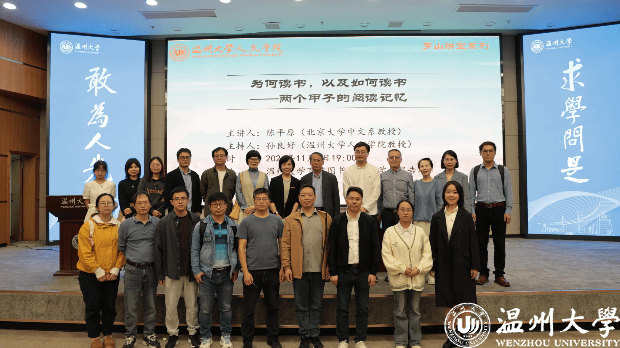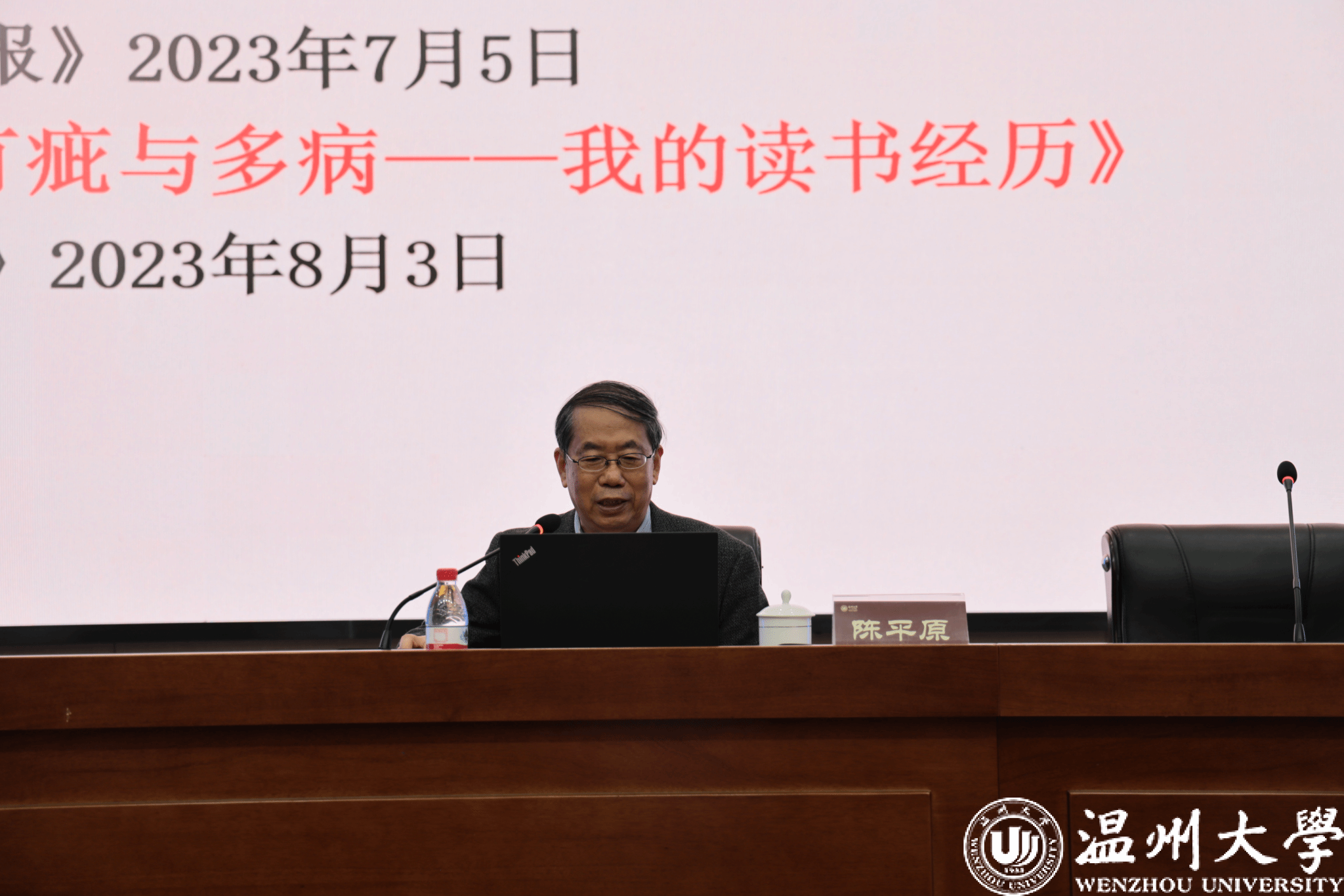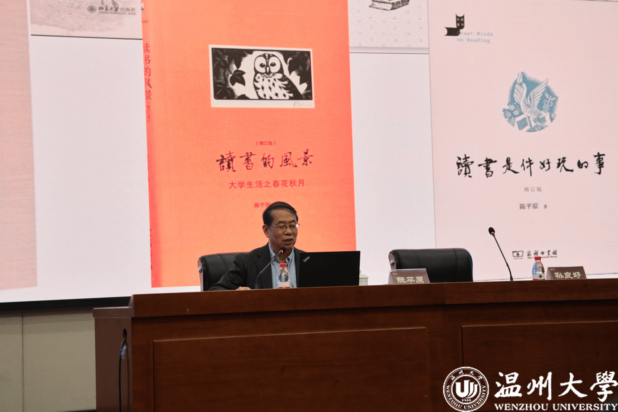 主持人孙良好教授用“十年之约”“联袂而来”“三位一体”三个词介绍了陈平原教授与温大罗山讲堂的因缘。“十年之约”是指陈平原教授接受了孙良好教授十年之约的邀请,自2014年春天做客罗山讲堂后的再次到来。“联袂而来”是指陈平原教授与夏晓虹教授这对中国文学研究界的“神雕侠侣”的联袂共赴。“三位一体”即孙良好教授认为陈平原教授是集文学、大学、读书为一体的学者。