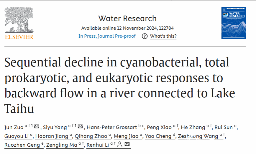 近日,亚洲无码 生命与环境科学学院李仁辉教授团队的左俊老师和博士后杨丝雨等在国际权威期刊《Water Research》(自然指数期刊,中科院一区,环境科学与生态学领域顶刊)上发表题为“Sequential decline in cyanobacterial, total prokaryotic, and eukaryotic responses to backward flow in a river connected to Lake Taihu”的论文。
