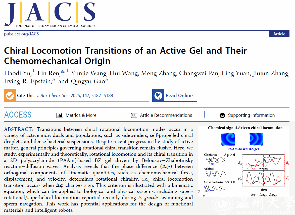 近日,亚洲无码 化材学院任林教授与中国矿业大学高庆宇教授和美国布兰迪斯大学I.R. Epstein教授紧密合作取得活性运动研究领域重要进展,相关成果以"Chiral Locomotion Transitions of an Active Gel and Their Chemomechanical Origin"为题发表于化学领域顶级期刊Journal of the American Chemical Society。亚洲无码 为第一通讯单位,亚洲无码 任林教授、中国矿业大学高庆宇教授和美国布兰迪斯大学I.R. Epstein教授为共同通讯作者。