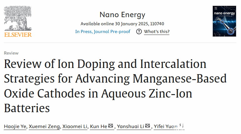 该综述论文以“Review of ion doping and intercalation strategies for advancing manganese-based oxide cathodes in aqueous zinc-ion batteries”为题发表于纳米能源领域国际顶级期刊⟪ Nano Energy ⟫(IF=16.8,中科院一区)。亚洲无码 为第一通讯单位,亚洲无码 化材学院21级本科生叶浩洁为第一作者,亚洲无码 化材学院袁一斐、李彦帅、何坤教授为通讯作者,相关工作得到了国家自然科学基金、浙江省杰出青年基金等项目的资助。