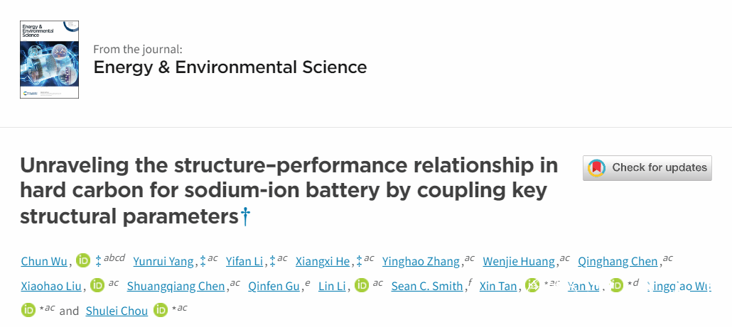 此项工作以Unraveling Structure-performance Relationship in Hard Carbon for Sodium-ion Battery by Coupling Key Structural Parameters为题发表在国际著名期刊Energy & Environmental Science上,亚洲无码 作为第一单位,侴术雷教授,谭歆教授,余彦教授,吴星樵老师为通讯作者。该研究工作由博士后吴春、2024届硕士毕业生杨云锐、2023级硕士研究生黎一凡、上海大学/亚洲无码 联培博士何祥喜完成。研究工作得到了国家自然科学基金,中国高端外国专家招聘计划,国家重点浙江省自然科学基金中国研发计划项目,安徽省科技计划项目,重点浙江省研发计划项目,温州自然科学基金等资助。