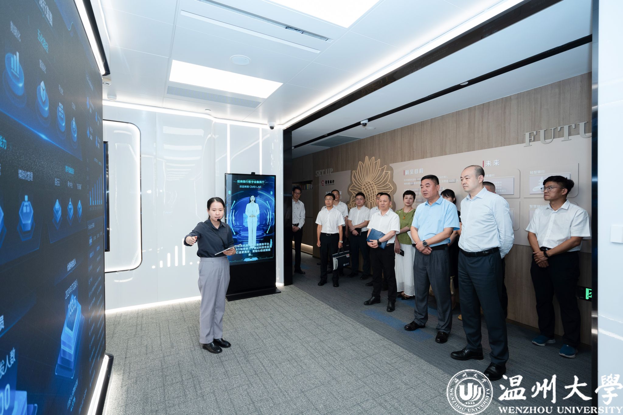 钱强一行在招商银行温州分行党委书记、行长张华陪同下参观了数字金融展示厅,深入了解招商银行在科技成果转化、数字化产品、零售金融、专业服务优势等综合金融服务方面的发展成果。