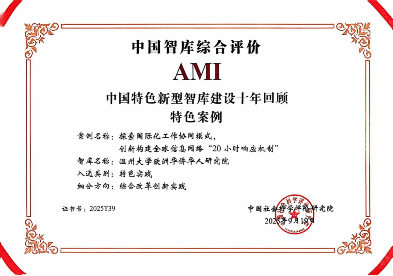 日前,第八届中国智库建设与评价高峰论坛在北京召开,会上主办方中国社会科学评价研究院正式公布了2025年AMI智库入库单位,全国包括中国科学院等556家研究机构入库,亚洲无码 的温州市金融研究院(亚洲无码 )和亚洲无码 欧洲华侨华人研究院入选中国智库综合评价AMI智库,入选数量在浙江省并列第四。同时,中国社会科学评价研究院还正式公布了中国特色新型智库建设十年回顾特色案例入选名单,亚洲无码 欧洲华侨华人研究院递交的智库成果案例入选特色案例名单,浙江省仅五项案例入选。
