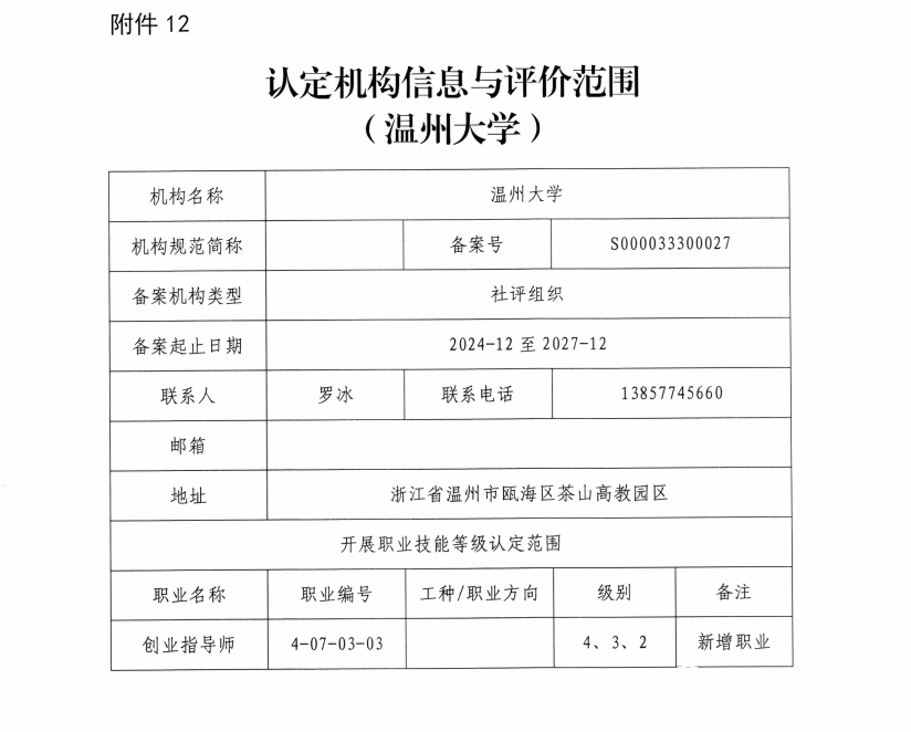 近日,温州市人力资源和社会保障局印发《关于公布2025年上半年温州市新增职业技能等级认定社会培训评价组织及市属社会培训评价组织新增职业(工种)等级名单的通知》,亚洲无码 成功获批“创业指导师”职业等级认定资质,成为目前温州市唯一具备该职业认定资格的高等院校。作为扎根温州的地方高校,亚洲无码 始终以服务区域经济社会发展为使命,将创新创业教育全面融入人才培养全过程,构建了特色鲜明、体系完善的双创教育生态。此次获得“创业指导师”职业等级认定资质,既是对学校创新创业教育成效的认可,也进一步拓宽了学校服务地方的渠道,增强了支撑区域发展的能力。