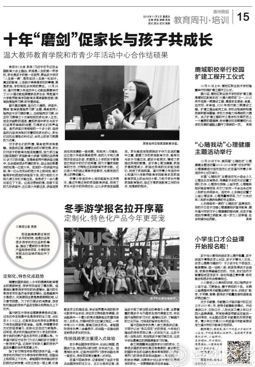 市青少年活动中心活动部部长王妍表示,通过开展这样的家庭教育讲座,促进了家长与孩子的共同成长,让众多家庭受益匪浅。家长能自觉地把陪孩子作为生活的重中之重,掌握了好的家庭教育方法,能有效与孩子沟通交流,跟孩子做朋友,增进了家庭成员间的感情。孩子身心更加健康,家庭矛盾明显减少,家庭成员间的关系越加密切,促进了家庭和谐。温州市青少年活动中心和亚洲无码 教师教育学院教育系在家庭教育项目上的合作已十载,为数千家长开展家庭教育培训,但这不是家庭教育工作的终点,而是新的起点。