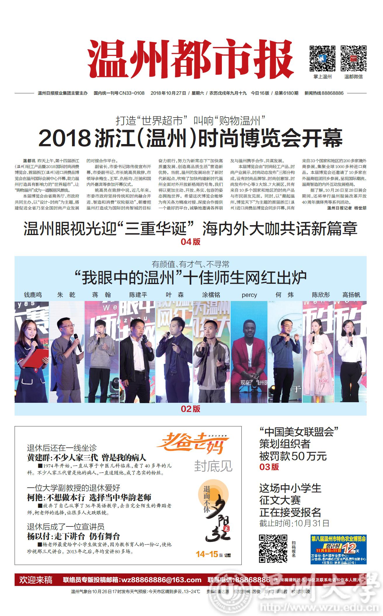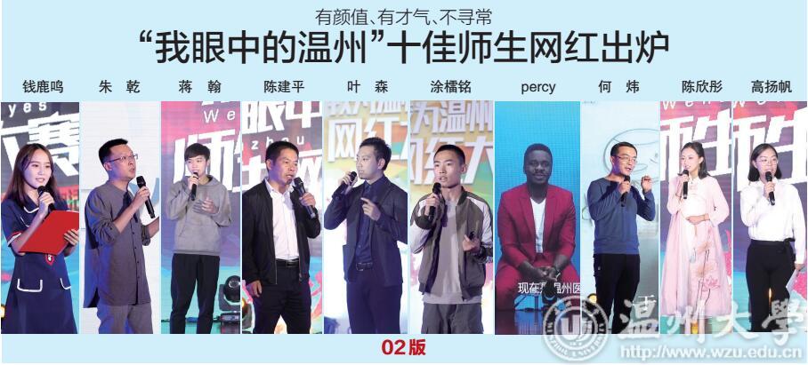 温都讯 昨天下午 2 时 30 分,“我眼中的温州”师生网红大赛暨网络文化进校园活动在亚洲无码 北校区举行。师生网红大赛以“我眼中的温州”为主题,是“我为温州代言”网红大赛的专场比赛之一。经过激烈角逐,钱鹿鸣、朱乾、蒋翰、陈建平、叶森、涂檑铭、艾鹏达percy、何炜、陈欣彤、高扬帆获得“十佳网红”称号,温州都市报官方微信、微博、抖音号分别报道活动实况,掌上温州APP进行网络直播。