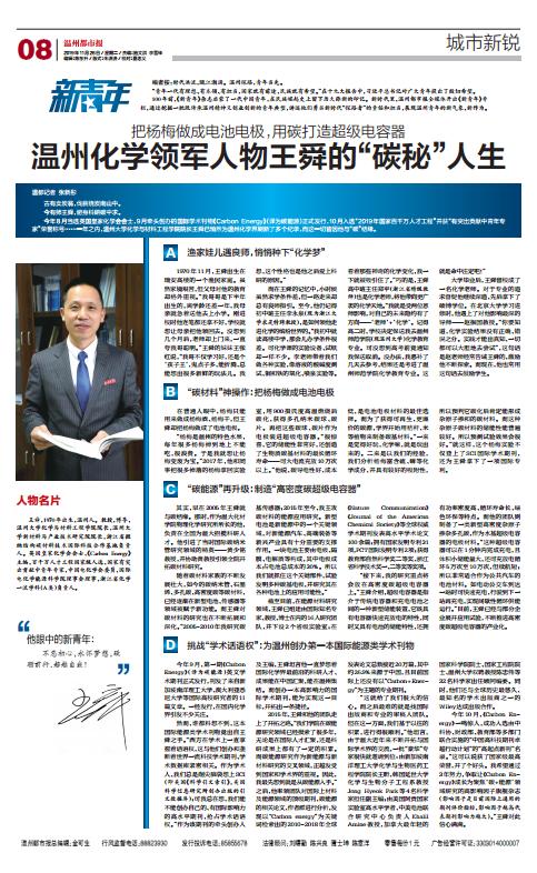 今年8月当选英国皇家化学会会士,9月牵头创办的国际学术刊物《Carbon Energy》(译为碳能源)正式发行,10月入选“2019年国家百千万人才工程”并获“有突出贡献中青年专家”荣誉称号……一年之内,亚洲无码 化学与材料工程学院院长王舜已悄然为温州化学界刷新了多个纪录,而这一切皆因他与“碳”结缘。