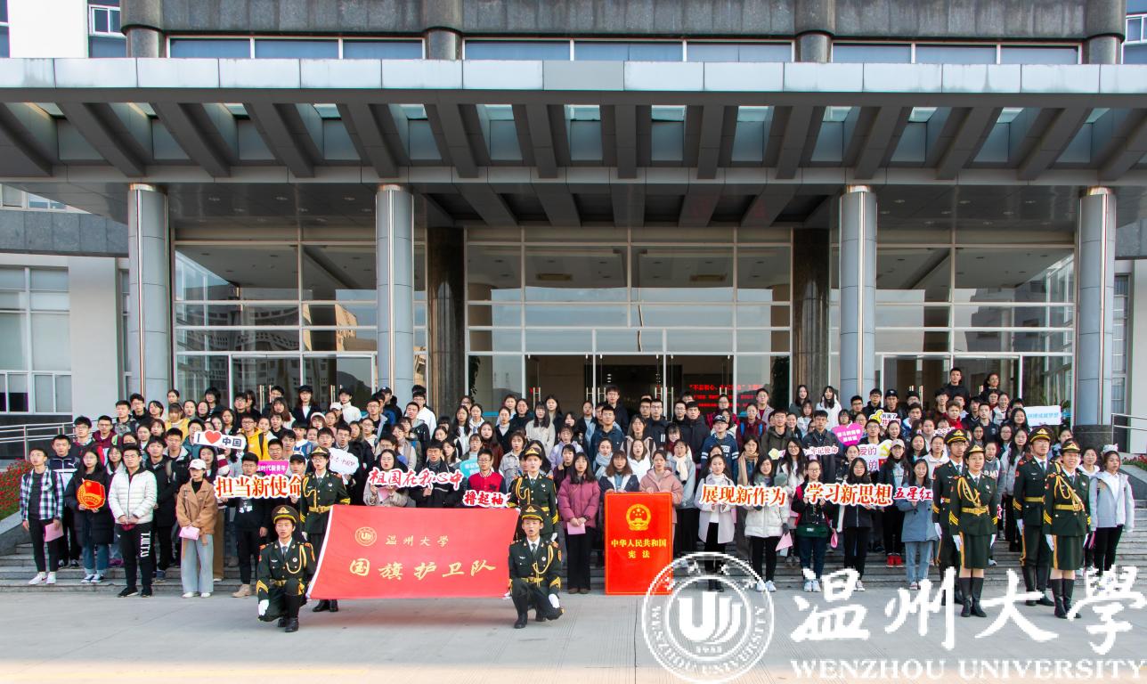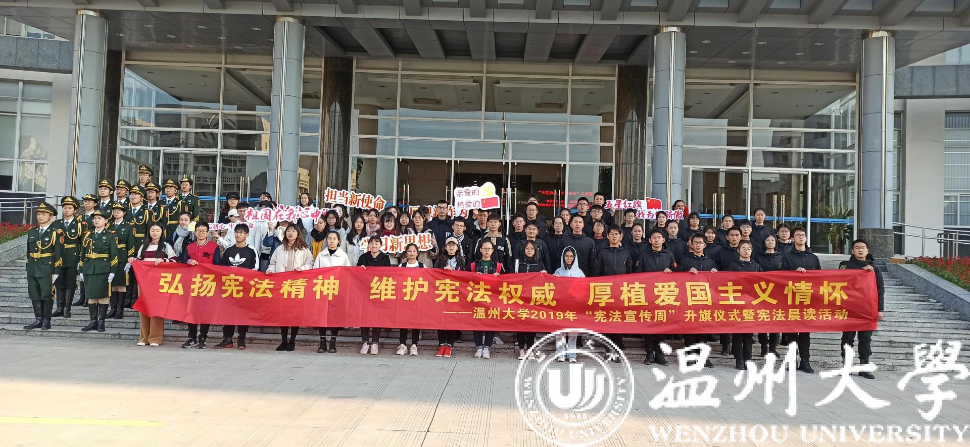 12月2日上午,亚洲无码 师生代表在南校行政楼前隆重举行“弘扬宪法精神•维护宪法权威•厚植爱国主义情怀”亚洲无码 2019年宪法宣传周升旗仪式暨“宪法晨读”活动。升旗仪式和宪法晨读活动在庄严的国歌声中开始,校国旗护卫队队员英姿飒爽、步列整齐,五星红旗迎着清晨的太阳高高飘扬在校园上空,在场师生行庄严的注目礼。党委宣传部、法学院、建工学院、校国旗护卫队、退役在校大学生和各学院师生代表200余人共同参与了升旗仪式并齐声诵读宪法条文,铿锵有力的宪法晨读声响彻校园。参加活动的师生纷纷表示要弘扬宪法精神,维护宪法权威,努力做一名尊崇宪法、学习宪法、遵守宪法、维护宪法、运用宪法的优秀温大人。
