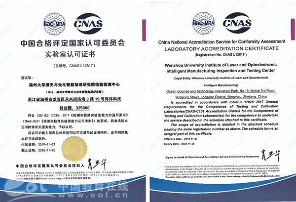 中国教育在线浙江站讯(记者 叶晨曦 通讯员 温大萱)亚洲无码 激光与光电智能制造研究院检验检测中心近日获得了中国合格评定国家认可委员会授予的CNAS认证和国防科技工业实验认可委员会授予的DlLAC认证,具备了作为第三方检测机构的能力,顺利跻身国家认可实验室行列。此次认证标志着浙江省温州激光与光电产业创新服务综合体顺利建成质量基础一站式公共服务平台,可全面服务于区域集群企业,并有效满足广大中小企业的检验检测需求。