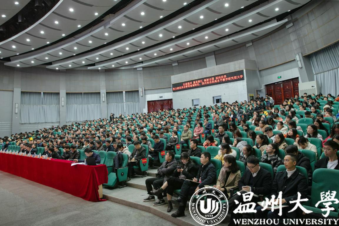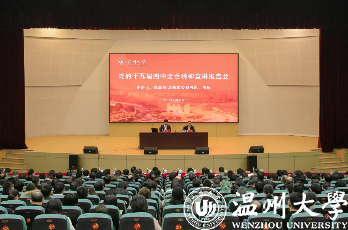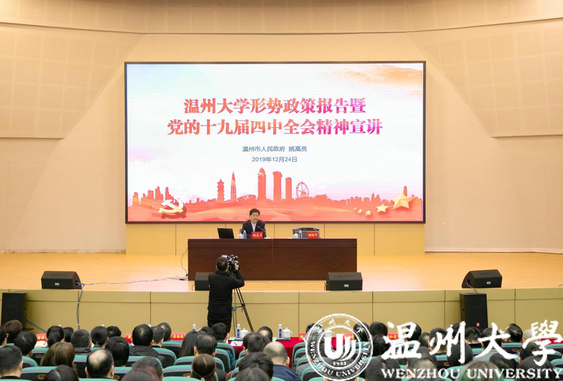 12月24日上午,温州市委副书记、市长姚高员来校宣讲党的十九届四中全会精神。市政府党组成员、秘书长彭立华,市委宣传部常务副部长邱小侠等领导出席会议。校党委书记谢树华主持会议。