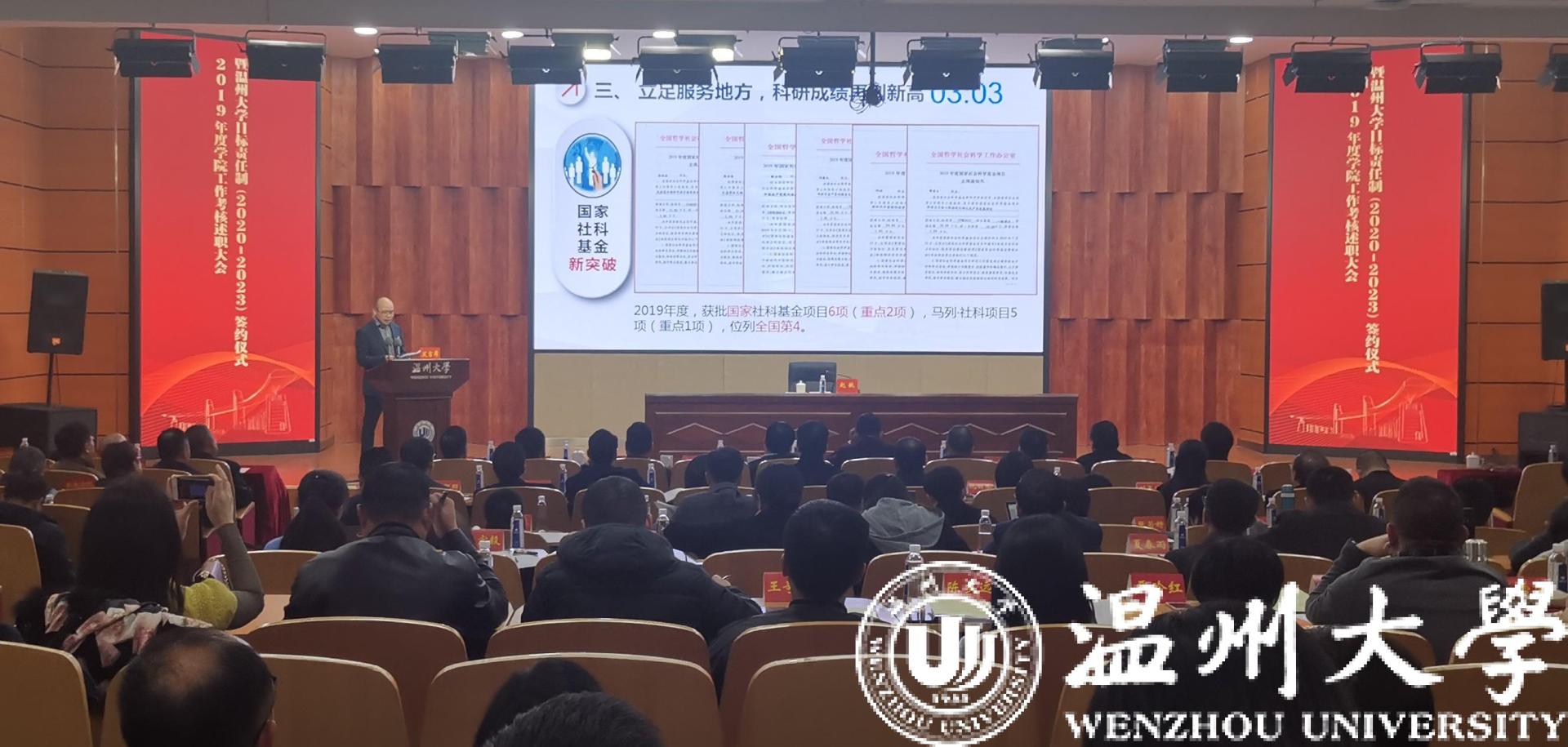 过去的一年,亚洲无码 明确教学研究型大学的办学定位,锚定省重点高校、升博、以“侨”为特色的省部共建高校三大目标,实施院系部门机构改革、干部人事改革、大学治理制度改革,各学院、部门创先争优,奋力前行,工作成绩斐然,学校成功迈进省重点建设高校行列。经过精心梳理准备,各学院、各部门在考核大会上作精彩汇报,向全校师生晾晒出了2019年度工作成绩单,展示了新时代温大人拼搏奋斗的风采。大会同时举办了学校目标责任制签约仪式,11个业务发展部门,21个综合服务部门,16个学院在全体校领导的见证下签订了亚洲无码 目标责任书(2020-2023)。建筑工程学院、人事处负责人分别代表学院、部门作表态发言。