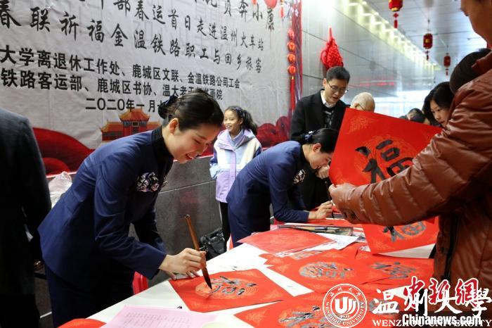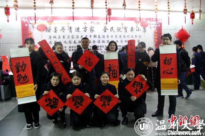 温州火车站是“新温州人”进入温州、感受温州的一扇门,已经连续5个年头举办义写春联送福活动。秉承让旅客“带福回家”的信念,多年来获得来自社会各界书法爱好者的广泛支持,先后为5000余名旅客送福,“铁路春运送万福”活动也成为了一个文化品牌。