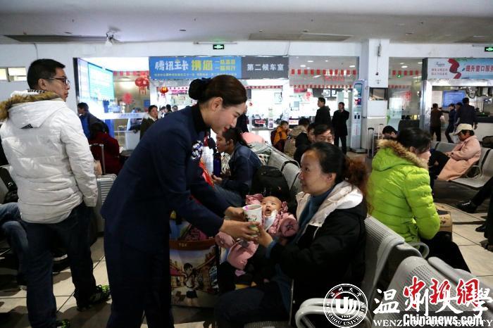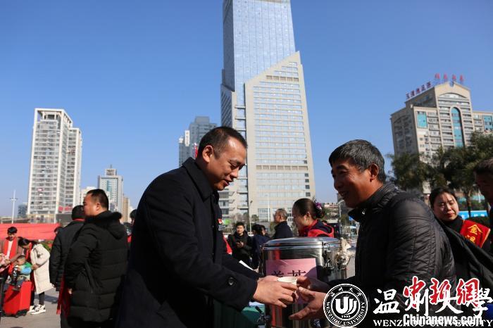 在温州火车站广场,客运作业区党员、志愿者组成一支20余人的志愿服务队,搭起服务站,准备好早上刚煮的姜茶,为旅客送上温暖与关爱。