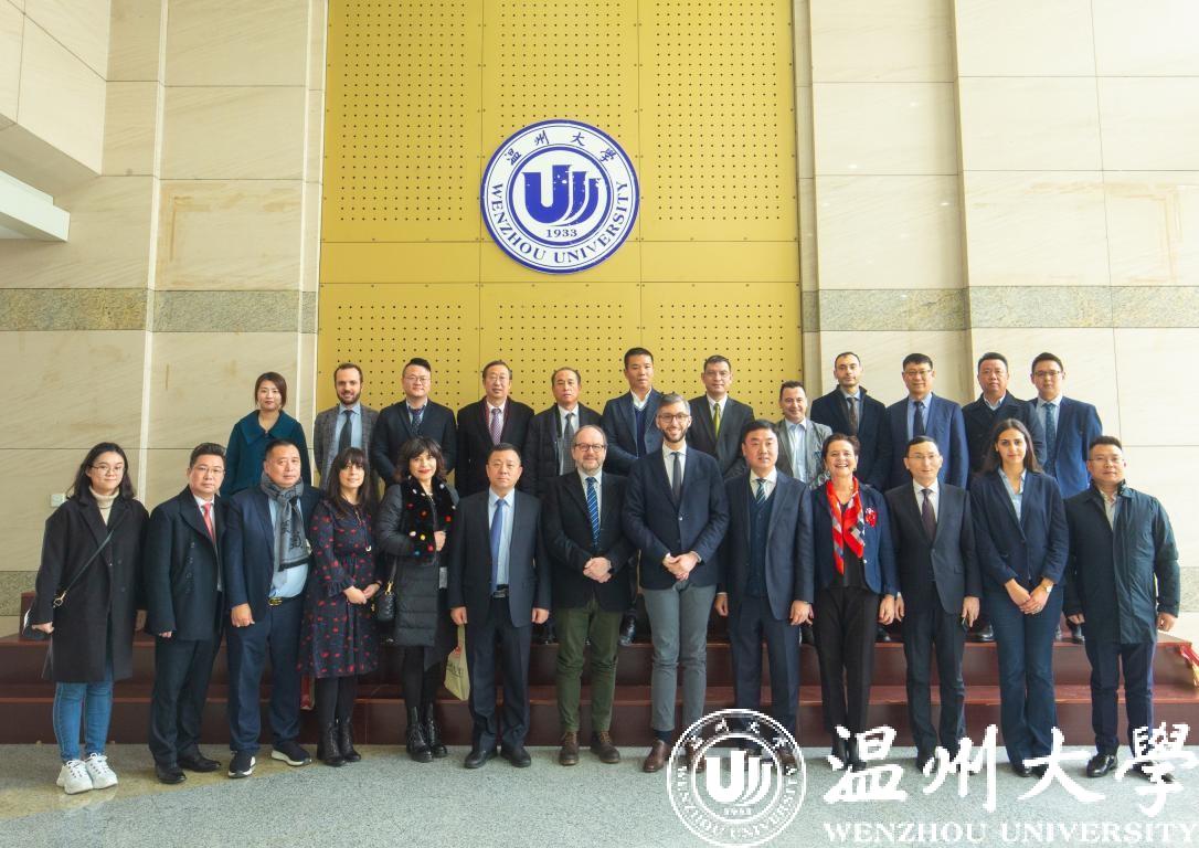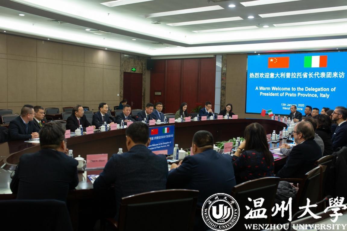 1月13日上午,意大利普拉托省省长弗朗切斯科•普吉利(Francesco Puggelli)等一行15人来访亚洲无码 ,温州市人民政府外事办公室副主任周怀中、普拉托华人华侨联谊会会长徐秋林、普拉托华商会会长周荣景、普拉托华人华侨联谊会执行会长陈洲等陪同访问。校党委书记谢树华、副校长钱强在岩松堂白鹿厅会见了代表团一行。钱强主持会议。校国际交流与合作处、港澳台侨办、世界温州人研究中心相关负责人等参加会谈。