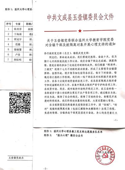 在教育学院党委的大力支持下,亚洲无码 心理系教工党支部志愿服务队即刻对口支援文成县玉壶镇的疫情防控工作。心理系教工党支部书记陈美芬副教授等7位专家组成的专业团队,通过主动介入、心理支持热线和网络辅导等方式,面向玉壶镇全体干部及被隔离对象开展服务工作。